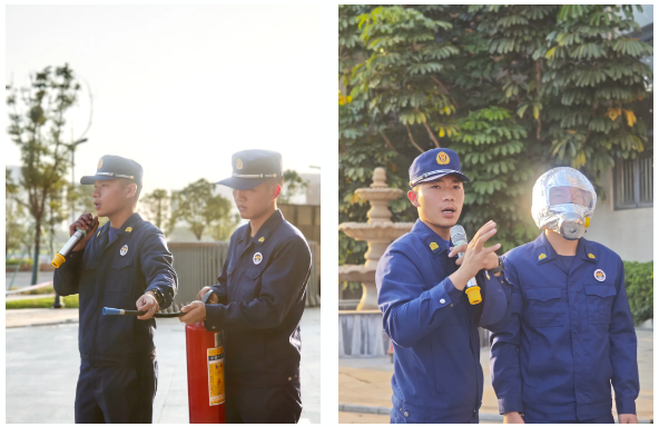 演練期間,現(xiàn)場(chǎng)演示講解了防煙面罩的正確佩戴技巧,以及滅火器的正確使用方法。依照“提、拔、握、壓”四字口訣,園區(qū)各部門(mén)員工依次進(jìn)行了滅火器實(shí)操,進(jìn)一步提高了掌握消防器材使用要領(lǐng)的能力。